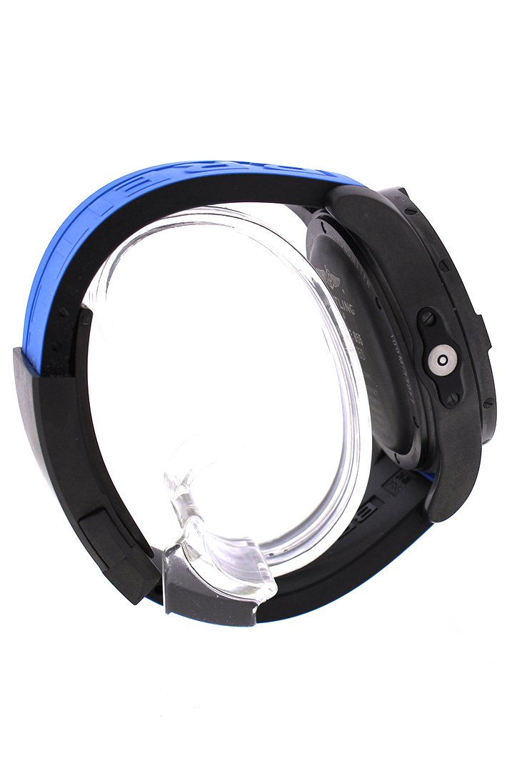 Black titanium case with a blue (diver pro III) rubber strap. Uni-directional rotating bezel. Volcano black dial with luminous hands and Arabic numeral hour markers. Minute markers around the outer rim. Dial Type: Analog. Digital perpetual. Superquartz movement. Scratch resistant sapphire crystal. Solid case back. Case size: 46 mm. Round case shape. Deployment clasp. Water resistant at 100 meters / 330 feet. Functions: hour, minute, second, perpetual calendar, countdown timer, 7 daily alarms, countdown/countup clock, utc world time. Additional Info: This watch has a pairing capacity. it can be connected via bluetooth to an apple or android smartphone. You can change certain settings on your watch using your smartphone. You can also receive phone call notification sent to your watch. It comes with a charging cable. Sport watch style. Watch label: Swiss Made. Breitling Exospace B55 Connected Blue Rubber Men's Watch