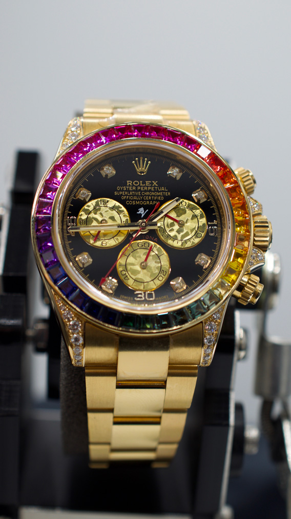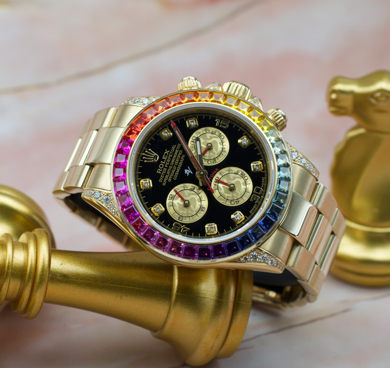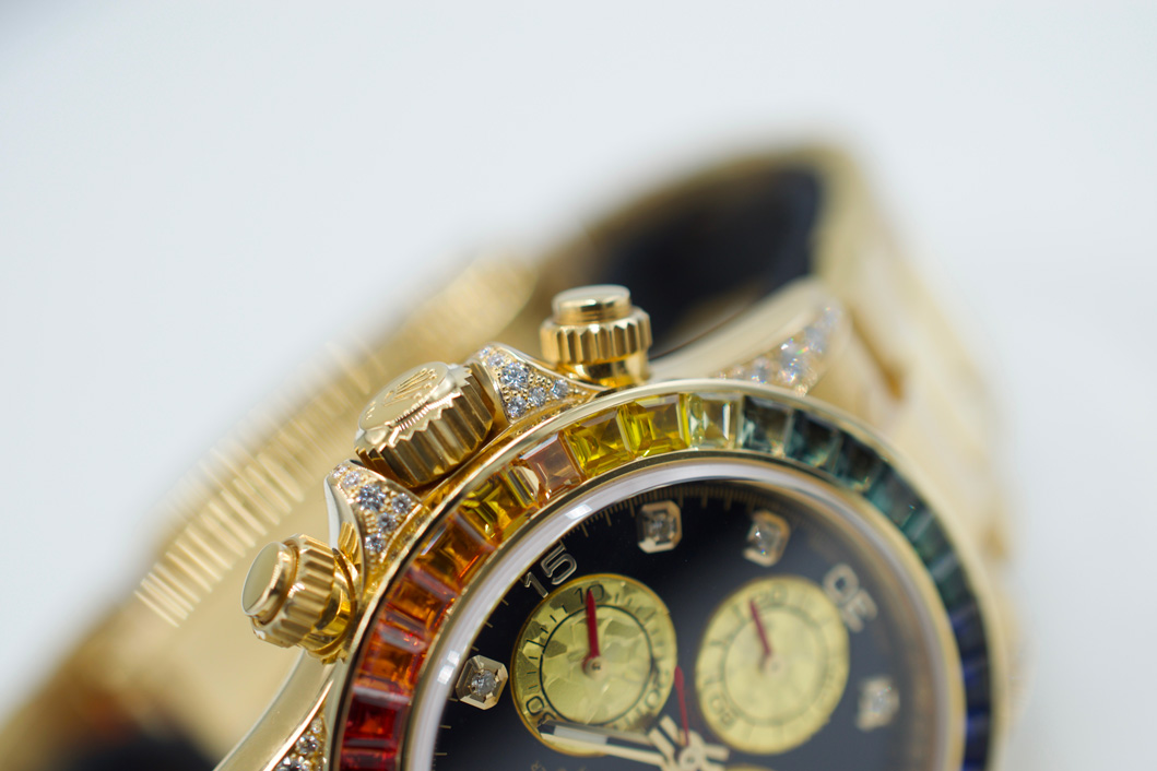 Adorned with 36 rainbow-hued sapphires on the bezel and 56 diamonds set on the lugs and crown guards, the dial features diamond-set indexes to complete the superlative and vibrant Daytona. With tremendous efforts to source the world's highest quality of gems, each stone is cut specifically to be fitted on the bezel, with each gemstone examined thoroughly for its cut, clarity and most importantly, colour. Hence, with its tedious process resulting in an extremely low production of all Rolex gem-set pieces, with the Rainbow being one of the toughest to execute.