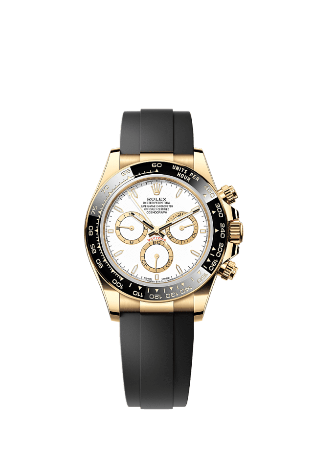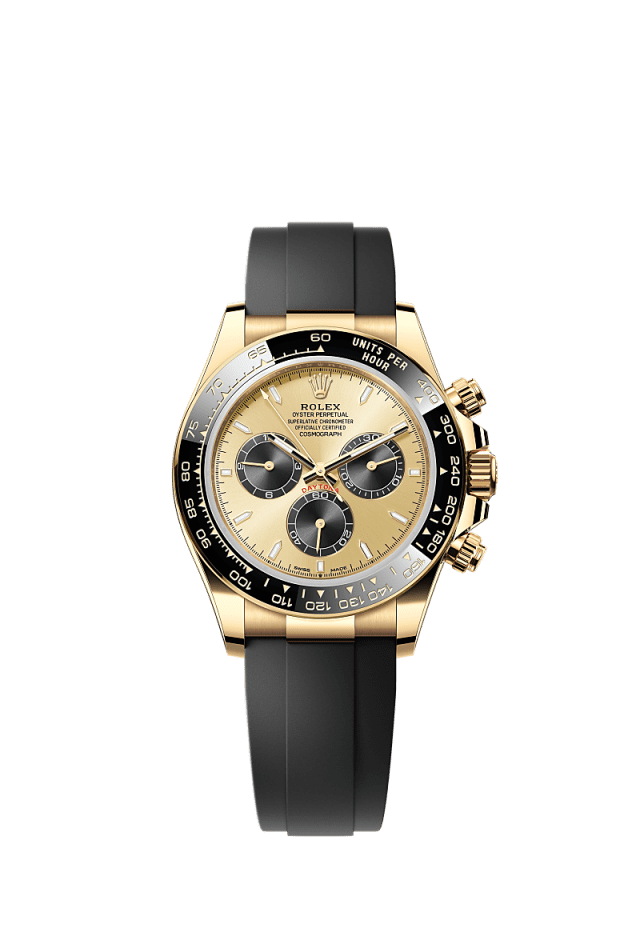 The 18 kt gold versions of the Cosmograph Daytona with a Cerachrom bezel are available with an Oysterflex bracelet. Developed by Rolex and patented, it singularly combines the robustness of a metal bracelet with the comfort of an elastomer bracelet.