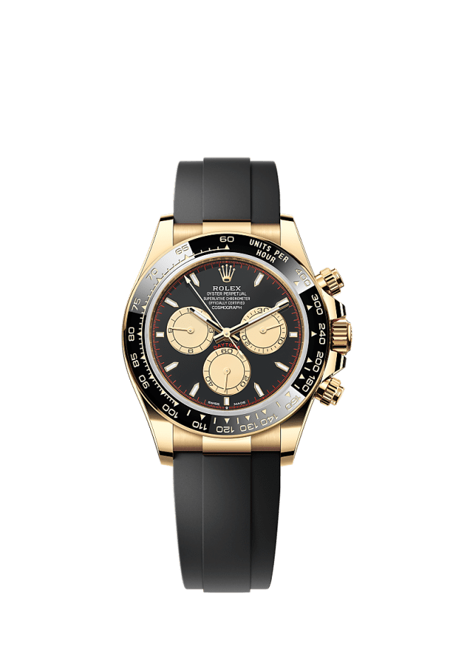 The 18 kt gold versions of the Cosmograph Daytona with a Cerachrom bezel are available with an Oysterflex bracelet. Developed by Rolex and patented, it singularly combines the robustness of a metal bracelet with the comfort of an elastomer bracelet.