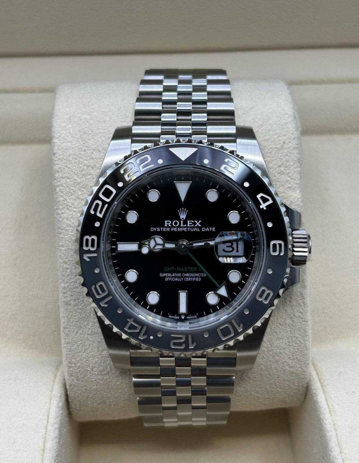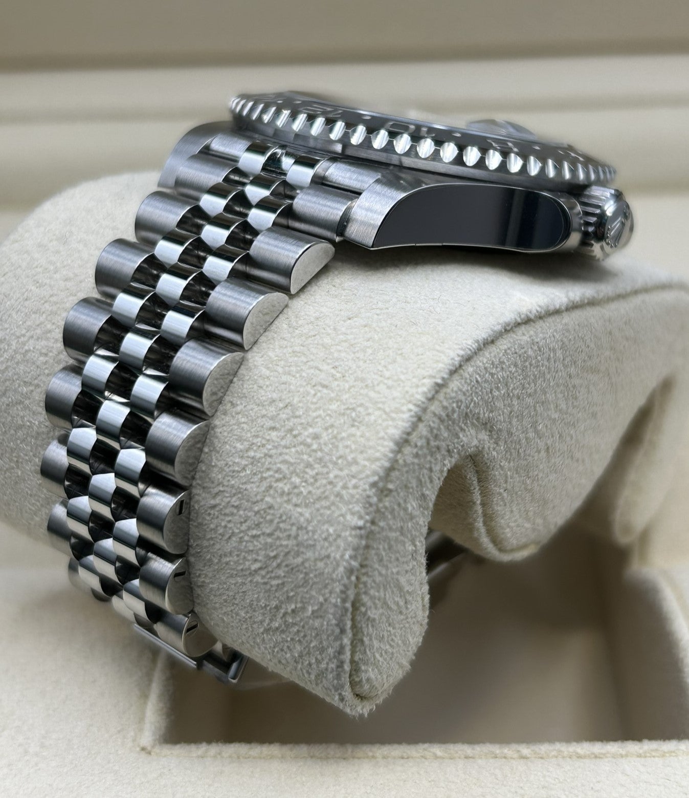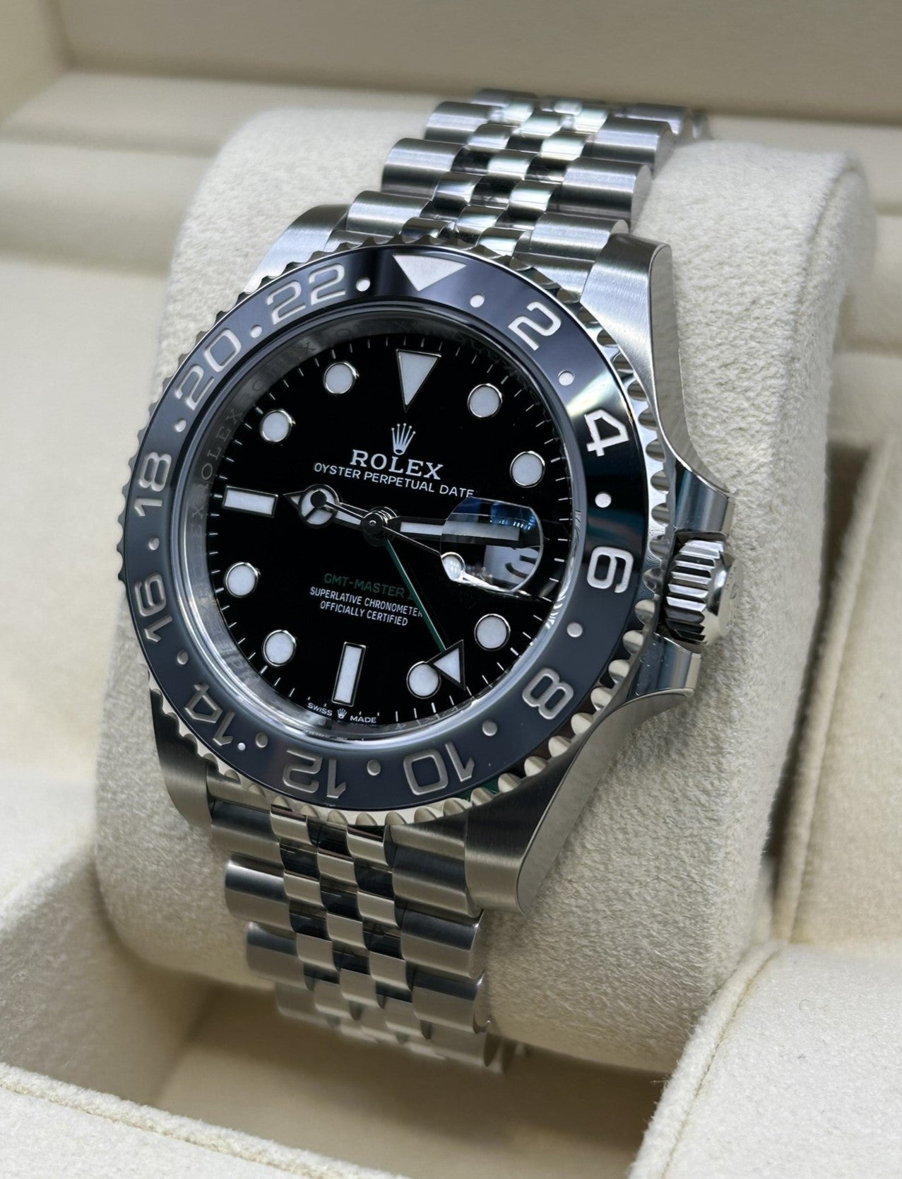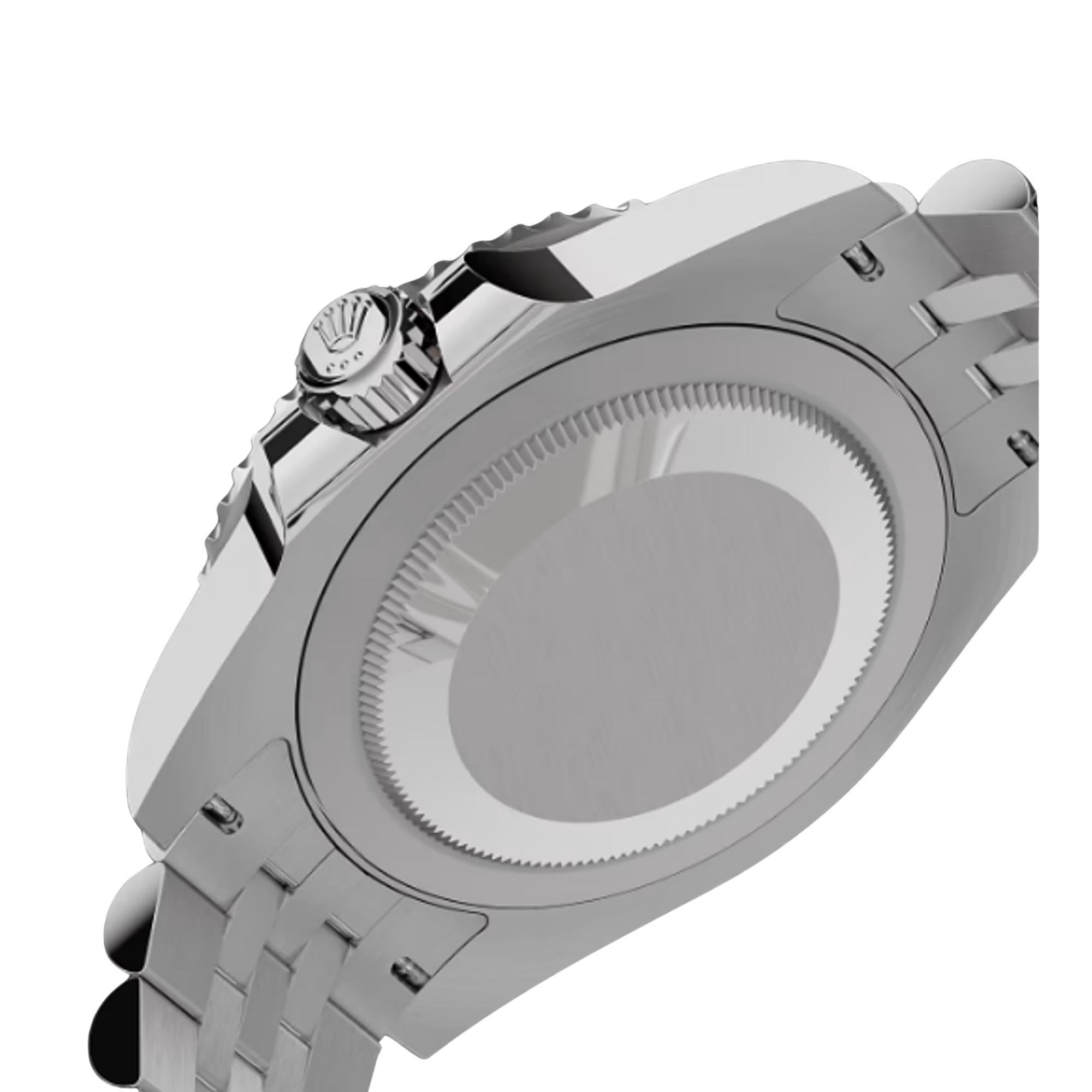 Unworn Rolex GMT-Master II Pepsi 40mm watch featuring a brushed and polished 904L Oystersteel stainless steel case. They have a Black dial with luminous Mercedes-logo hands and Breguet-style shape hands. The arrow-tipped red GMT hand circles the dial every 24 hours and allows tracking of a second-time zone. Broad hands as well hour markers in simple shapes – triangles, circles, rectangles – are filled with a blue luminescent material emitting a long-lasting glow, which ensures excellent readability. Minute markers around the outer rim. A scratch-resistant sapphire crystal with Cyclops lens over the date protects the dial. Date display at the 3 o’clock position. Monobloc middle case, screw-down case back. Polished Oystersteel screw-down crown with Rolex's patented "Triplock" triple waterproofness system. A distinctive blue and red bidirectional rotating 24-hour bezel with Cerachrom insert in ceramic and engraved with numerals and graduations. The movement is mechanical self-winding, Rolex in-house caliber 3285 with 31 jewels and 70 hours of power reserve. The watch is presented on a brushed and polished 904L Oystersteel stainless steel Oyster bracelet of flat three-piece links with a folding Oysterlock safety clasp with Easylink 5 mm comfort extension link. The water resistance is up to 100m/330ft. The Watch comes complete with store papers and a Rolex box. Will include 3 years Store Warranty.