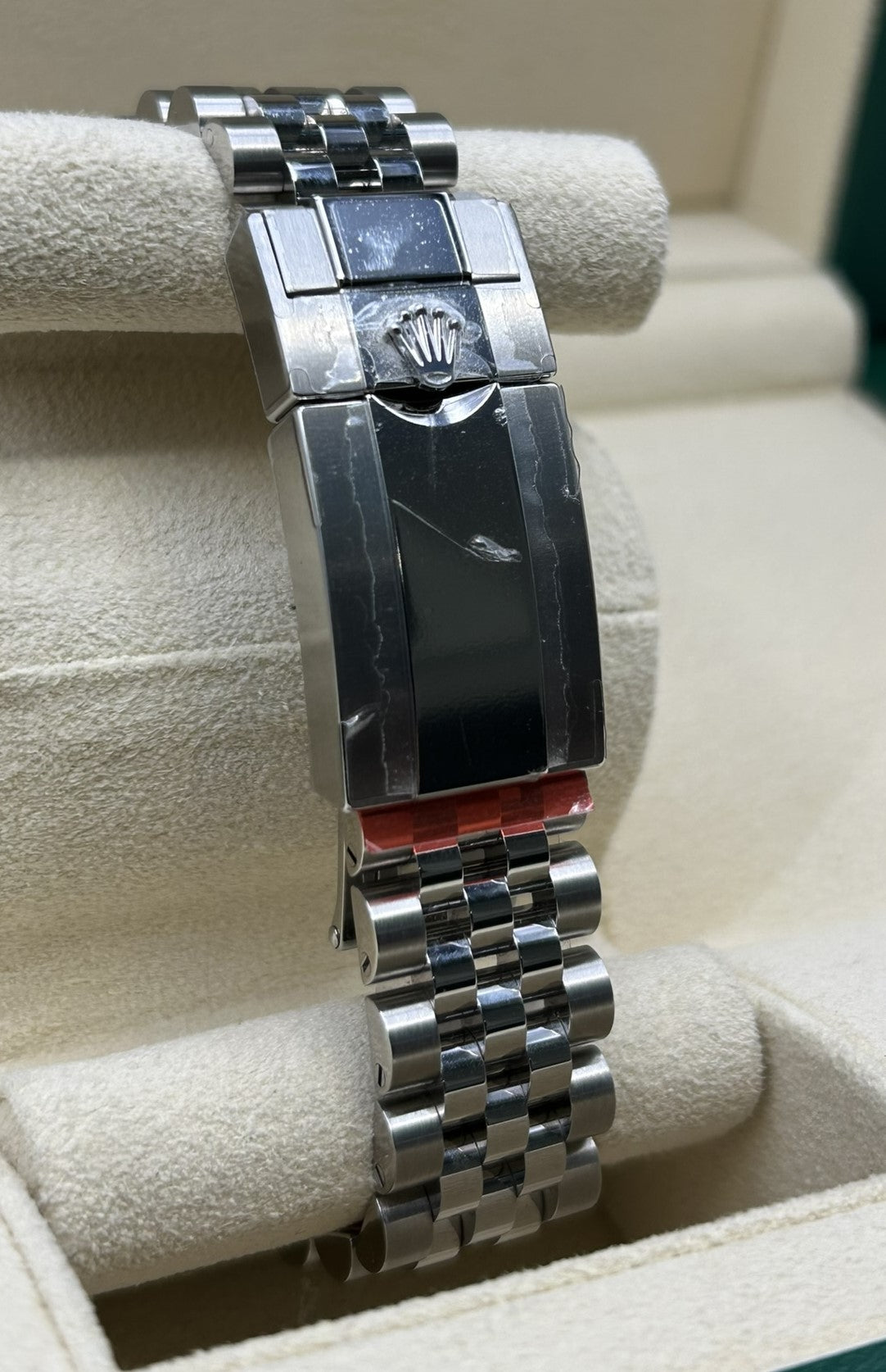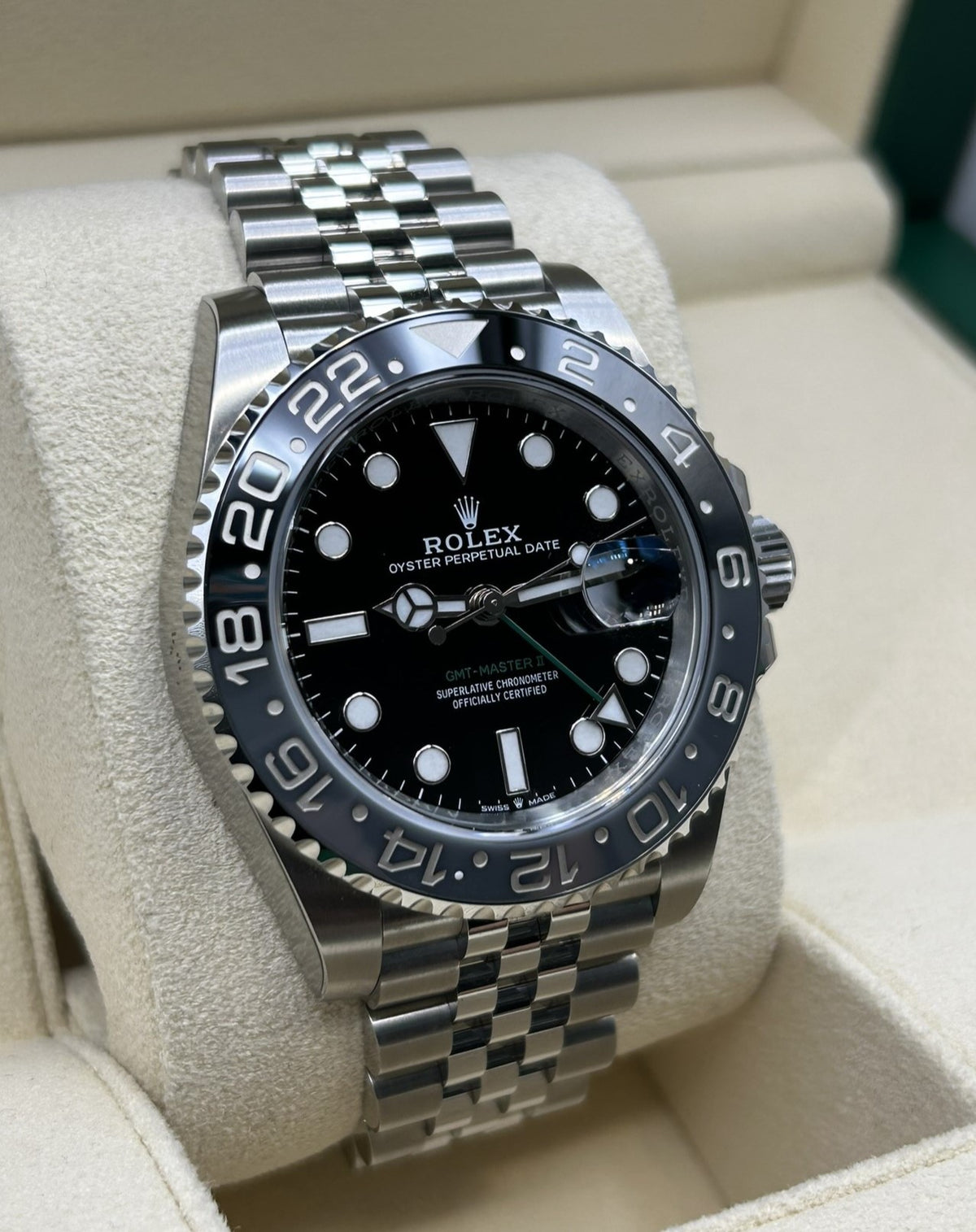 Unworn Rolex GMT-Master II Pepsi 40mm watch featuring a brushed and polished 904L Oystersteel stainless steel case. They have a Black dial with luminous Mercedes-logo hands and Breguet-style shape hands. The arrow-tipped red GMT hand circles the dial every 24 hours and allows tracking of a second-time zone. Broad hands as well hour markers in simple shapes – triangles, circles, rectangles – are filled with a blue luminescent material emitting a long-lasting glow, which ensures excellent readability. Minute markers around the outer rim. A scratch-resistant sapphire crystal with Cyclops lens over the date protects the dial. Date display at the 3 o’clock position. Monobloc middle case, screw-down case back. Polished Oystersteel screw-down crown with Rolex's patented "Triplock" triple waterproofness system. A distinctive blue and red bidirectional rotating 24-hour bezel with Cerachrom insert in ceramic and engraved with numerals and graduations. The movement is mechanical self-winding, Rolex in-house caliber 3285 with 31 jewels and 70 hours of power reserve. The watch is presented on a brushed and polished 904L Oystersteel stainless steel Oyster bracelet of flat three-piece links with a folding Oysterlock safety clasp with Easylink 5 mm comfort extension link. The water resistance is up to 100m/330ft. The Watch comes complete with store papers and a Rolex box. Will include 3 years Store Warranty.