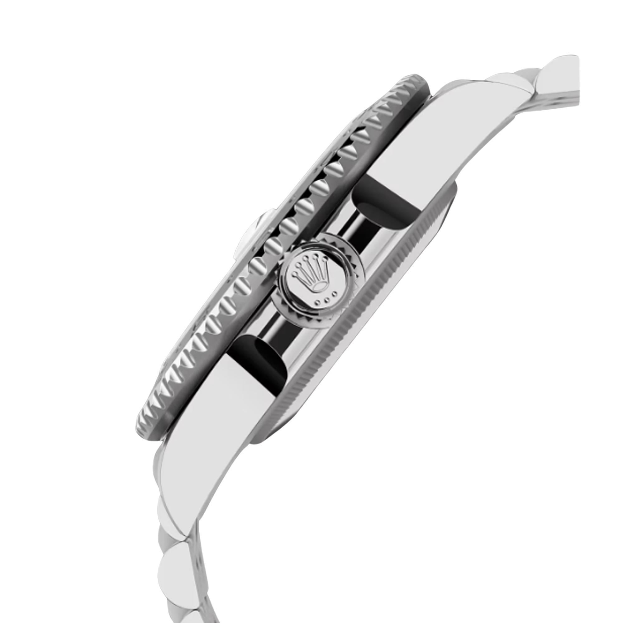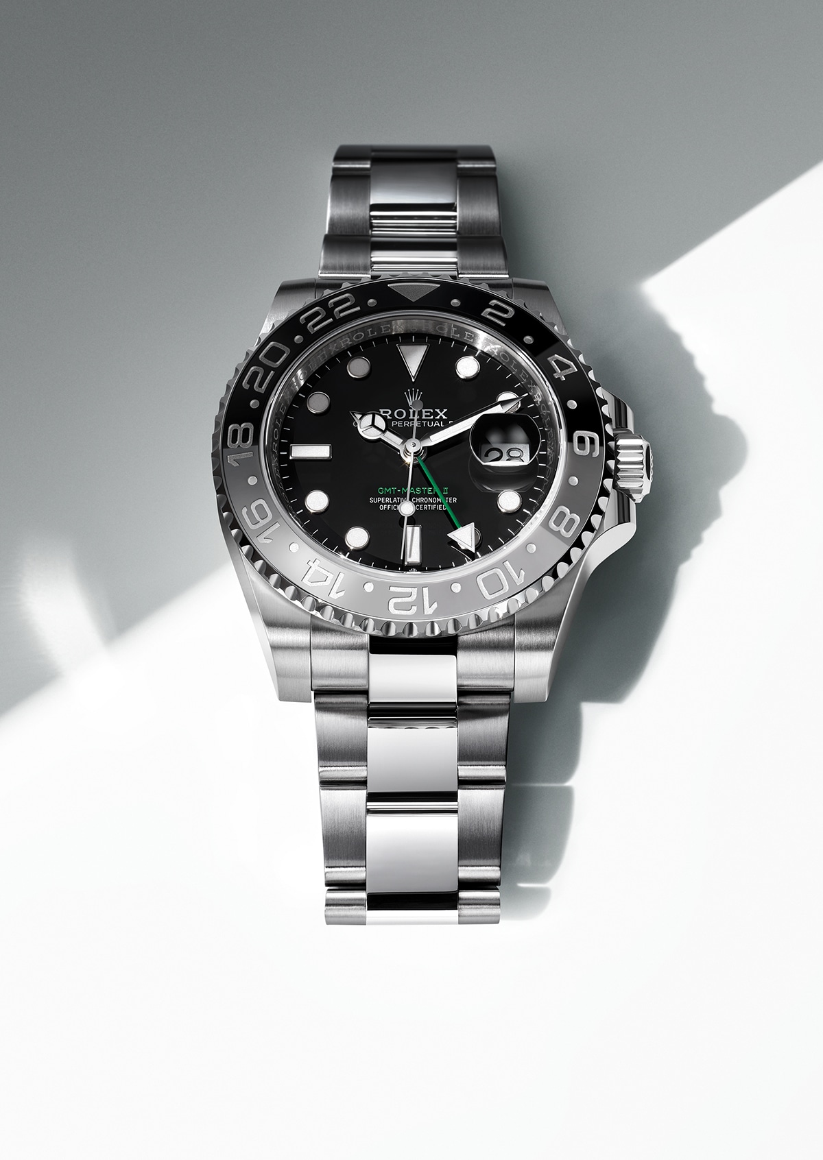 This model features a black dial and a two-colour Cerachrom bezel insert in grey and black ceramic. In addition to conventional hour, minute and seconds hands, the GMT-Master II features an arrow-tipped hand, which circles the dial once every 24 hours, as well as a bidirectional rotatable 24-hour graduated bezel.