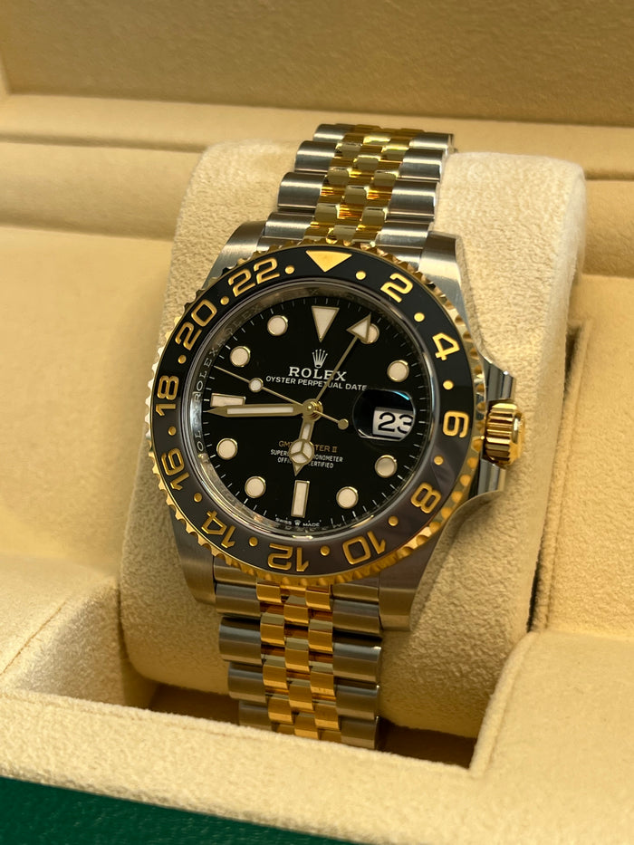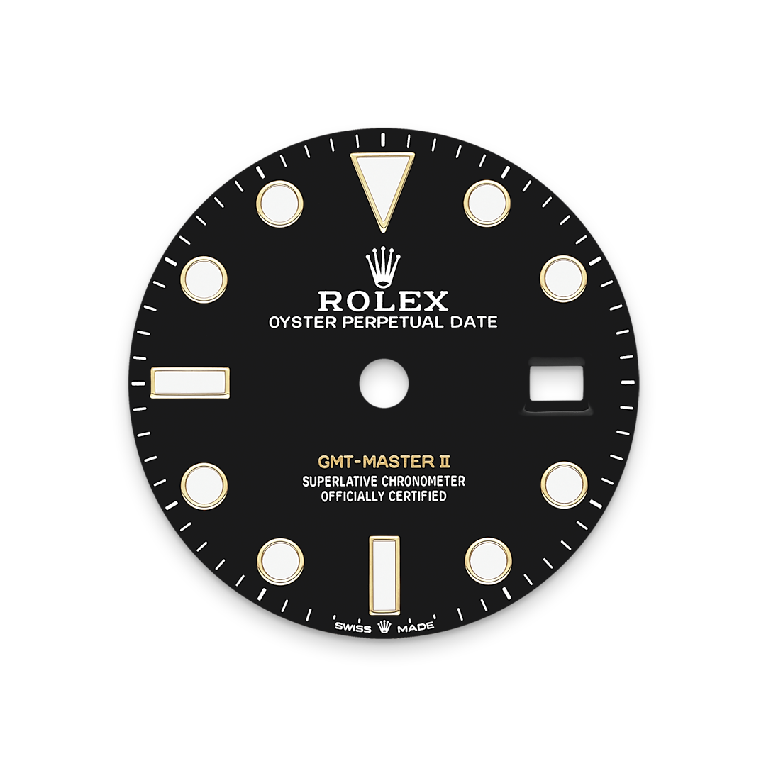 The Oyster Perpetual GMT-Master II in 18 ct yellow gold with a black dial and a Jubilee bracelet.
