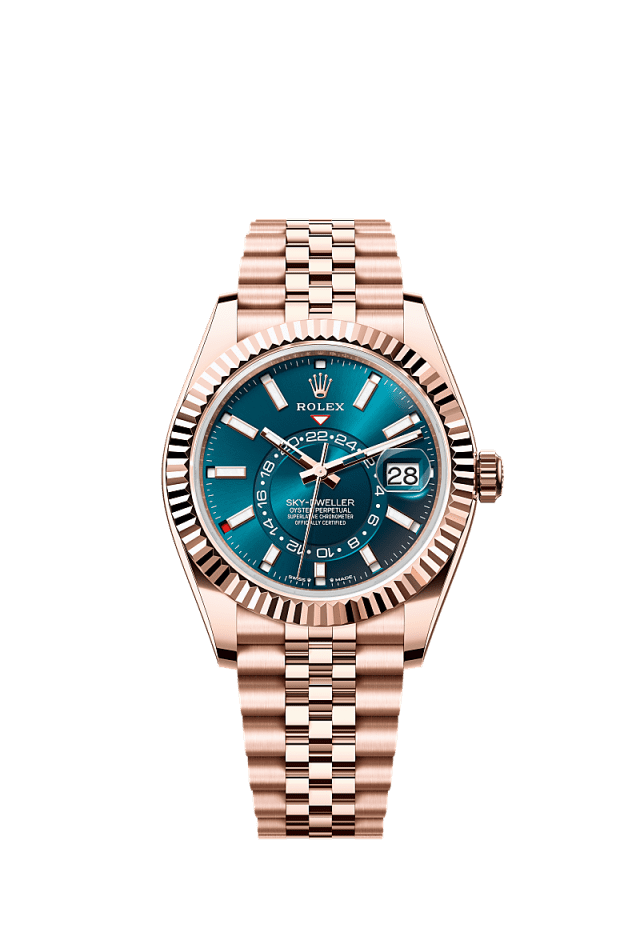 The Oyster Perpetual Sky-Dweller in 18 kt Everose gold with a slate dial and a Jubilee bracelet.